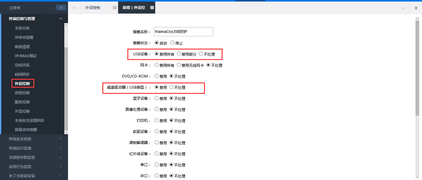 ? ? ? 從管理界面打開(kāi)“外設控制”策略,并按如下配置后分配到所有設備,減少通過(guò)USB移動(dòng)存儲設備的感染風(fēng)險。